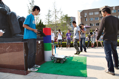 “机器人越障献花”比赛在西区严济慈铜像广场举行,要求机器人在8分钟内识别路标,准确找到行走路线,攀爬台阶,到达严济慈像前献花。图为越障机器人顺利完成献花任务。