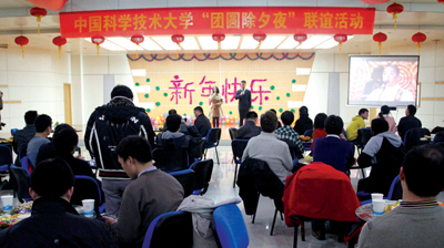 本报讯 1月30日农历除夕之夜,由校资产与后勤管理部、校团委、物业中心联合举办的2014年留校大学生“团圆除夕夜”活动在西区学生活动中心三楼多功能厅举行。我校近百名寒假留校同学、留学生及国外来访教授欢聚一堂、集体守岁。