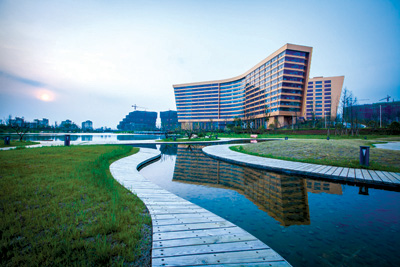 中国科大先进技术研究院位于大蜀山西麓、合肥高新技术产业开发区核心地带,一期建设占地575亩,总建筑面积约53万平米,主要包括高层次人才培养、先进技术研发、先进技术转化及公共服务设施等四个单元。截止2014年一季度,一期工程省市已投入12亿元建设资金,建成29万㎡,学生公寓、食堂、社区警务、医疗、公共交通及部分教室已建成并投入使用,可基本满足技术研发和人才培养的需求。图为先研院综合主楼——“未来中心”。