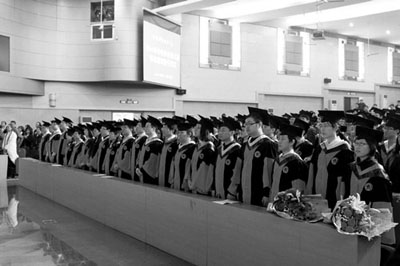 在豪迈的校歌旋律中,同学们身着学位服依次登上主席台,校领导和导师们为他们一一扶正流苏,合影留念。