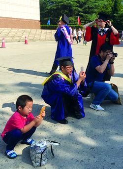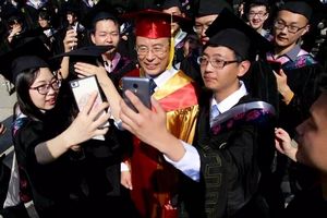 毕业典礼之前,同学们围着万立骏校长求合影玩自拍。