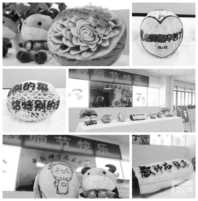 为了给教师节活动增添多样色彩,他们还精心准备了一组教师节主题的西瓜与冬瓜雕刻作品,吸引了就餐老师驻足开心观望,并纷纷拿出手机拍摄留影。