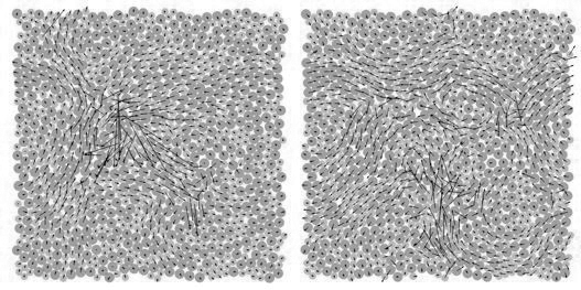 二维Jammed固体在经历压缩(左)和剪切(右)不稳定过程中的位形和粒子位移场(箭头)