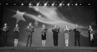 朗诵会在古香古色、韵味十足的古筝表演《墨雨》中缓缓拉开序幕,演出内容按照《大国泱泱》《砥砺前行》《继往开来》《伟大复兴》四个篇章有序推进。在一个多小时的演出中,表演者以爱国主义为核心的民族精神为索引与象征,结合实时交互特征的多媒体视觉设计,以革命符号和红色元素为基本素材,通过现场的朗诵、演唱、演奏,展现出气势恢弘的历史音画和气象万千的时代交响。