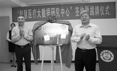 5月15日上午,中国科大附属第一医院(安徽省立医院)、大数据分析与应用安徽省重点实验室共建“智慧医疗大数据研究中心”协议签约暨揭牌仪式在附一院举行。副校长朱长飞,附一院党委书记刘同柱、院长许戈良、副院长等严光出席会议,我校科研部、大数据学院,以及附院信息中心、医务处等职能部门负责人参会。这是继附一院“肿瘤免疫研究治疗中心”成立后校院深度融合的又一重大举措。图为朱长飞(右)与刘同柱在揭牌现场。