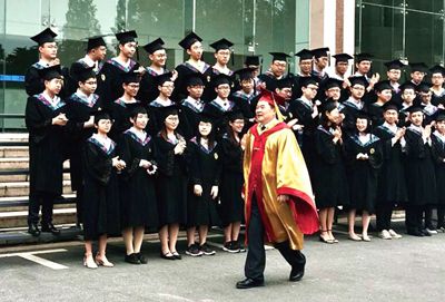 每每此刻,着学位袍的校长都会敬业地在等着合影的毕业生方阵之间不停歇地奔走穿梭,这份亲和受到了毕业生同学的欢呼喝彩与众多家长的喜悦围观。