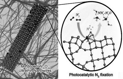 基于钼掺杂精修缺陷态的W18O49催化剂用于光驱动固氮合成氨示意图