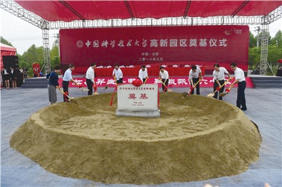 合肥市委常委、常务副市长罗云峰介绍了中国科大高新园区规划及建设情况;李国英宣布项目开工,在主席台就坐的领导一起为中国科大高新园区挥锹培土奠基。