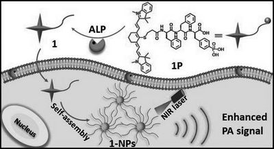 光声技术对浅表肿瘤的成像具有很高的空间分辨率。然而,就我们所知,利用肿瘤高表达的碱性磷酸酶来激活探针用于肿瘤的光声成像并没有文献报道。梁高林教授课题组合理设计了一种化学结构式为1P的近红外探针,同时提出了一种碱性磷酸酶控制的、肿瘤细胞内自组装近红外纳米粒子用于肿瘤的增强光声成像策略(如图)。研究发现1P在碱性磷酸酶的作用下生成去磷酸化的产物1,1被肿瘤细胞摄取后自组装形成纳米粒子从而增强肿瘤的光声成像信号。他们与苏州大学的程亮教授课题组合作,发现纳米粒子的形成在体外会使光声成像信号增大6.4倍。体内肿瘤光声成像结果表明,与碱性磷酸酶抑制剂处理的对照组相比,实验组的肿瘤光声成像信号增强了2.3倍。需要指出的是,如果把1P中的Phe-Phe-Tyr(H2PO3)-OH片段换成其他酶切序列,采用这个策略可以发展出更多的“智能”光声成像探针用于精准诊断他们相对应的癌症。