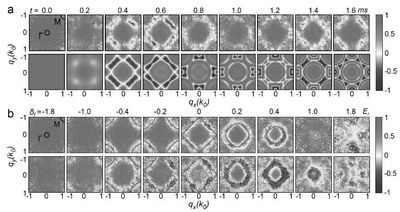 研究小组对2016年实现的二维自旋轨道耦合进行了改进,提出优化的理论方案,在实验上构造出高度可控、对称与长寿命的二维自旋轨道耦合玻色气体。在此基础上,研究小组利用非平衡态动力学方法在实验上首次直接精确测量了能带拓扑。他们利用量子淬火机制,使体系处于非平衡态,并在二维自旋轨道耦合哈密顿量下进行幺正动力学演化。在演化过程中,他们观察到自旋极化在二维准动量空间上产生了圈状结构,此结构被证实是近期理论提出的拓扑能带反转面的直接证据,进而可以直接判断能带的拓扑性质并得到拓扑陈数。不仅如此,通过实验调节拓扑能带参数,自旋极化的圈状结构的尺寸也随之变化,由此可以精确标定出拓扑非平庸区域的边界,测定体系的拓扑相图。相对于一般的平衡态方法,非平衡态动力学方法对原子温度以及高能带的影响不敏感,具有很强的普适性,也可以推广到高维的多种拓扑体系中来简单直接精确地测量体系拓扑。