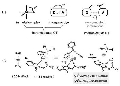 图1.催化剂体系和电荷能量转移模型(上)、光催化反应装置(下)