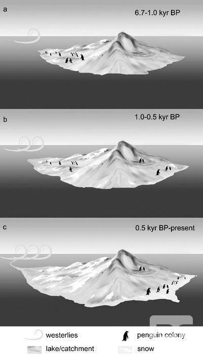 模拟结果显示,截止本世纪末,将有70%的王企鹅放弃原有栖息地或消失。然而,由于现代观测资料的持续时间较短,使得企鹅种群动态对长期气候变化的响应模式和机制认识不足,无法进行有效的生态变化预测和物种保护。
