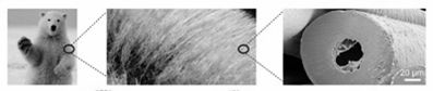 本报讯 与人类或其他哺乳动物的毛发不同,北极熊的毛发是中空的。在显微镜下放大后,每一根毛发都存在空腔结构,这种中空的管状结构不仅降低了北极熊毛的密度,而且有利于减小热导率,阻隔热量从北极熊的皮肤表面扩散到周围的低温环境中,值得设计新型人工隔热材料效仿。
