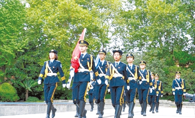 升旗仪式最后一项,全体师生重温入团誓词。校学生国旗护卫队出中国共产主义青年团团旗,参加仪式活动的全体师生集体宣誓,用青春之声和坚定的理想信念告白祖国。