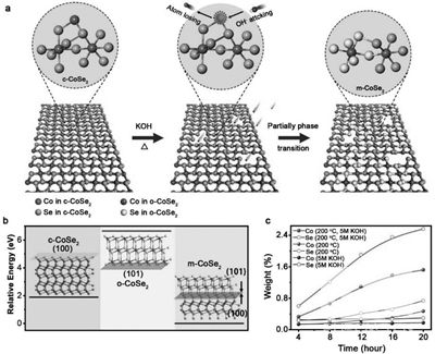 研究人员通过碱热法处理立方相CoSe2, 使得部分Co与Se原子从完美的立方相CoSe2晶体中逸出,生成原子级别的缺陷。电化学测试显示,混合相CoSe2催化剂在5万次循环之后,极化曲线没有明显变化,同时催化剂在400多个小时工作后,其在10 mA cm-2的过电势没有明显增加。