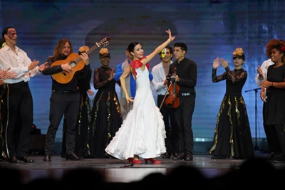 12月2日晚,古巴西班牙舞蹈团应邀来到我校演出舞剧《剧院魅影》。该团是拉丁美洲第一支在欧美大陆享有盛誉的西班牙风格舞蹈团,被誉为“拉丁美洲的玫瑰”。《剧院魅影》是该团最受欢迎的保留剧目,在当代西班牙舞蹈中融入传统舞蹈,通过不断的尝试和创新,已成为舞团的经典剧目之一。舞台上,戴着面具的“魅影”神秘而有魅力,雨点般急切的踢踏舞步、斗篷的张扬与吸睛、挺拔的身姿与高贵的气质令人赞叹;而女主角克里斯汀将柔美与力量共同糅合在舞蹈中,仿佛那最艳丽的康乃馨。精彩的演出赢得了观众阵阵热烈的掌声。千余名师生共同欣赏了这场视听盛宴。 (教务处 图/ 文)