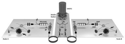 中国科大潘建伟、包小辉、张强等与济南量子技术研究院和中国科学院上海微系统与信息技术研究所合作,在量子中继与量子网络方向取得突破。他们通过发展高亮度光与原子纠缠源、低噪高效单光子频率转换技术和远程单光子精密干涉技术,成功实现远距离量子存储器纠缠,为构建基于量子中继的量子网络奠定了基础。