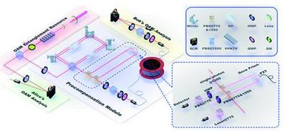 针对高维轨道角动量纠缠分发中面临的问题,李传锋、黄运锋研究组与暨南大学、中山大学研究组合作,自主研发了适用于光子空分复用的少模光纤,设计了轨道角动量模式色散预补偿装置,首次在1公里光纤中实现了三维轨道角动量纠缠光子对的分发。分发后的量子态通过广义贝尔不等式(CGLMP不等式)的验证,得到3个标准偏差的不等式违背,验证了量子态的高维非局域性。针对在光纤中的模式色散退相干特性,研究组还提出了进一步扩展其维度和传输距离的实现方案。该工作为未来利用空间模式复用技术实现长距离的高维量子信息任务提供了可能性。