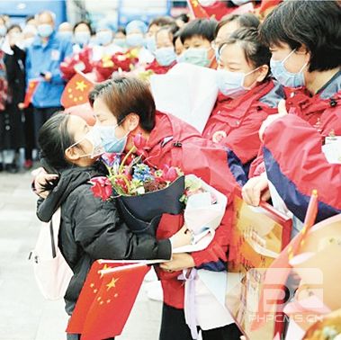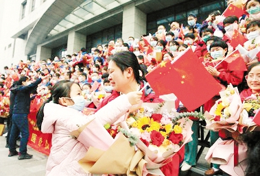 欢迎仪式上,舒歌群、包信和、刘连新向队员们献上鲜花并合影留念。很多队员的家人、同事也来到现场,接队员回家。医院将继续给队员为期一周的假期休息,让逆行的英雄们享受与家人团聚的时光。