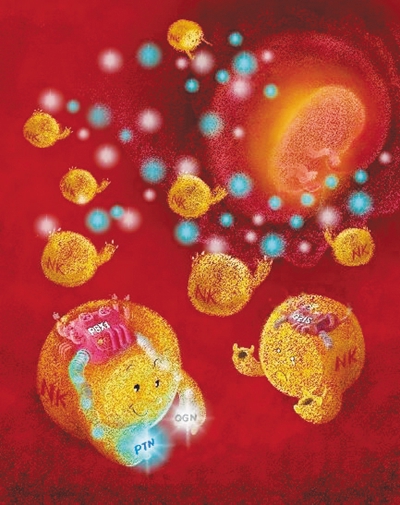 图为蜕膜 NK 细胞促进胚胎发育。母胎界面 NK 细胞(黄色)仿佛“机器人保姆(Robotic Nannies)”滋养胚胎发育,而转录因子 PBX1 是驱动生长因子PTN(蓝色)和 OGN(白色) 产生的强大发动机。(王国艳和陈磊绘制)。
