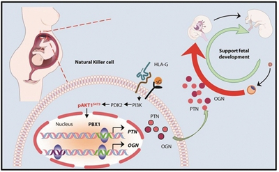 转录因子的鉴定是确认新型功能细胞亚群的有力证据,课题组通过蜕膜 NK 细胞全基因筛选并结合产生生长因子蜕膜NK 细胞亚群的分析,鉴定转录因子 PBX1 在产生生长因子的蜕膜NK 细胞亚群中高表达。通过信号通路抗体芯片筛查发现,胚胎来源的HLA-G 信号可以通过蜕膜 NK 细胞表面 ILT2 分子激活蜕膜 NK 细胞 PI3K-AKT 信号通路,驱动 PBX1 的表达。进一步通过染色质免疫共沉淀测序分析,发现转录因子 PBX1 可以直接结合生长因子PTN 和 OGN 的启动子,增强其转录表达。