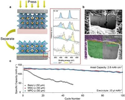 进一步地,研究人员发展了方便的固相转印方法,将旋涂法制备的高质量氯基钙钛矿 (MASnCl3和MAPbCl3)薄膜原位地转移到在锂箔表面,形成具有梯度结构的导锂层。该金属卤化物钙钛矿导锂层可以改善电解液与锂金属的界面问题,实现致密的锂金属沉积和脱出,避免了锂枝晶生长和锂金属电极的粉化)。最终的锂金属全电池电化学循环测试表明,在金属卤化物钙钛矿导锂层的保护下,即使在贫锂(50 μm)和有限电解液(20 μl mAh-1)以及2.8 mAh cm-2面容量的严格条件下循环100圈后容量仍保持在80%以上,而没有保护层的锂金属电池在循环50圈后容量已降低到初始的40%。