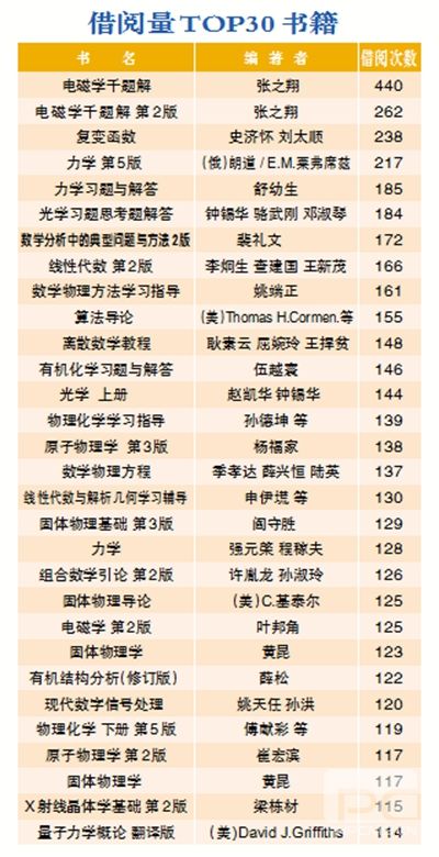 本年度位居借阅量榜首的是《电磁学千题解》,借阅次数达到440次。这本书多次位居我科图书馆借阅排行榜首,由于收录题型丰富,解法详尽,内容覆盖面广而受到广大师生的欢迎。《力学》、《力学 第5版》、《力学习题与解答》、《复变函数》、《光学习题思考题解答》、《线性代数 第2版》等理工类书籍借阅量也很可观,彰显了科大的理工特色。