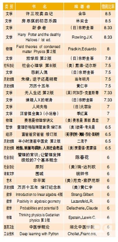 在图书借阅中,借阅比更能说明1本书的受欢迎度。指的是一本图书被借阅的次数与它的馆藏复本数之比。例如,图书A一共3本,全年被借阅6次,借阅比为2;图书B一共10本,全年被借阅10次,借阅比为1。和往年一样,这次榜单,文学类书籍占比依然很高,表明我科小伙伴虽然长于理工,但仍对文学艺术有浓厚的兴趣。