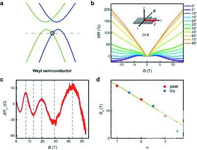 a. 外尔半导体能带结构示意图,圆圈表示外尔点。b. 手性反常导致的负磁阻效应。c.d. 强磁场下观测到的以磁场对数为周期的磁阻振荡行为。