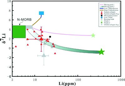 对于西藏榴辉岩样品的Li同位素研究表明,俯冲蚀变洋壳形成的岩石总体具有高的锂浓度和亏损7Li的同位素组成。进一步的模拟结果显示,俯冲过程中的板片脱水与折返过程中的沉积物分异流体之间的混合,是形成榴辉岩中锂同位素特征的主要原因(图1)。研究揭示了俯冲低温蚀变洋壳的Li同位素特征及其地球化学行为,证明了俯冲带Li同位素体系主要受控于变质脱水和折返流体交代过程,但也可能被俯冲的变质沉积岩所影响。这些认识为理解榴辉岩锂同位素特征和俯冲带锂同位素地球化学行为提供新的思路。