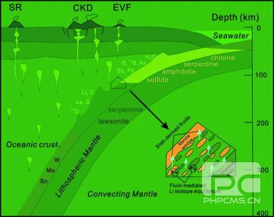 对勘察加半岛不同火山密集区岛弧岩石的Li同位素研究表明,随着俯冲深度的增加,板片分异流体逐渐减少,而锂同位素组成变化范围较小。模拟计算结果显示板片分异的流体对勘察加岛弧岩浆的锂同位素体系影响程度有限,地幔楔可能存在再平衡过程,因此岛弧岩石往往具有类似于洋中脊玄武岩的锂同位素特征。该研究对揭示全球岛弧岩石锂同位素的组成特征提供了关键信息。