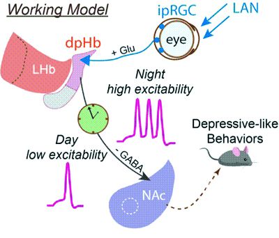 一系列的研究实验证明了是夜间不正常光线而不是节律或睡眠的紊乱造成抑郁样行为,并且发现了该环路的可兴奋性受到昼夜节律门控调制,首次诠释了光在白昼和夜晚截然相反的情绪作用的内在机理。