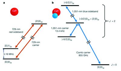 首先,科学家们将Ca+原子离子和CaH+分子离子捕获在离子阱里。由于两种离子的质量相差无几,又都带电,所以在库伦作用下,他们像被弹簧连在一起,共同振动,这种联合的振动就像一个桥梁,把分子的转动态和原子的轨道态联系在了一起。