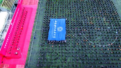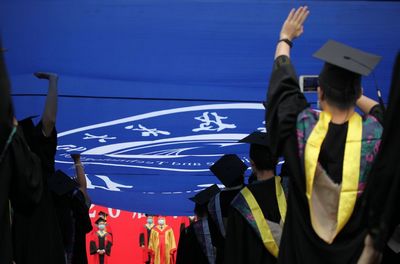 典礼现场,神圣的出校旗仪式。蓝色校旗从激动的毕业生上方缓缓飘过。
