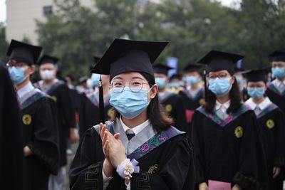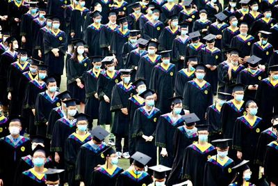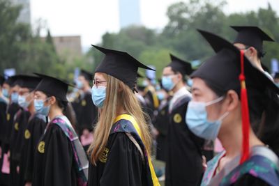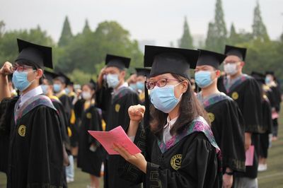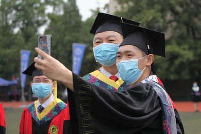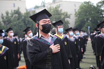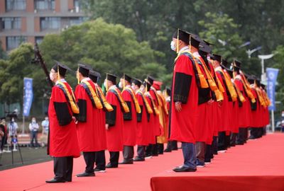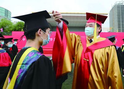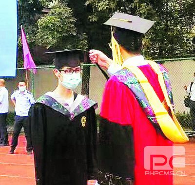 典礼现场,一名毕业生没吃早饭晕倒了,工作人员立刻将他扶到队伍外休息,校医和老师都奔过来帮忙,给学生补充糖分,照顾他直到恢复状态。少年班学院院长卢征天教授看到这一幕,立刻大步走来,帮学生整理好衣服,又郑重为他扶正流苏。感动的学生执礼恭敬鞠躬致谢,卢教授也含笑鞠躬回礼。校风师风学风,传承于无声之中。