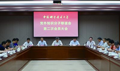 本报讯 7月2日,学校无党派知识分子联谊会正式更名为党外知识分子联谊会,并召开第二次会员大会,选举新一届理事会。校党委书记舒歌群,安徽省知联会会长、校长包信和,安徽省委统战部副部长王琦出席会议并讲话,校党委常委、统战部部长褚家如主持会议。