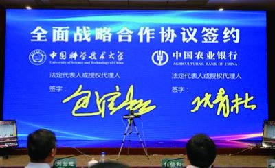 中国农业银行行长张青松、中国科大校长包信和分别代表双方在北京、合肥,通过线上方式签署全面战略合作协议。