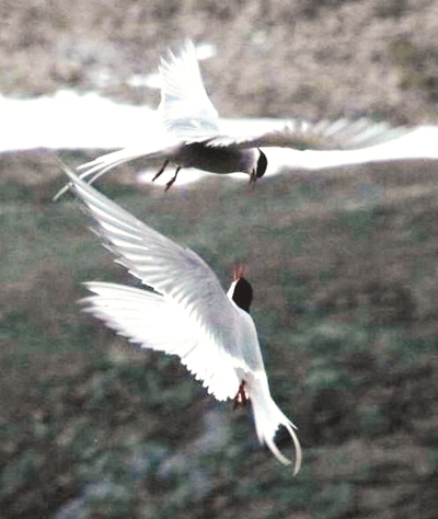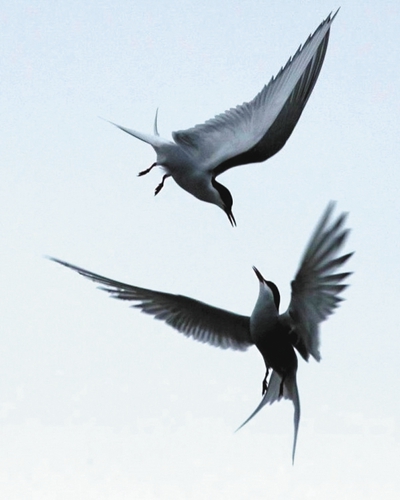 就这样,从16点49分到51分,一对北极燕鸥嬉戏追逐,忽上忽下;对歌求偶,一上一下;继而拥抱、接吻……生动而浪漫。