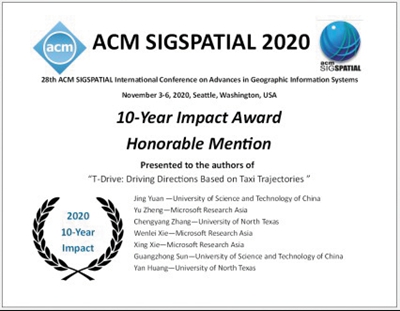 本报讯 11月3日至6日,第二十八届ACM SIGSPATIAL国际学术会议在美国西雅图召开,会上颁发了2020年度“十年影响力奖”(10-year Impact Award)。由中国科大、微软亚洲研究院、北德克萨斯大学的研究者合作的研究论文“T-Drive:Driving Directions Based on Taxi Trajectories ”获唯一荣誉奖(Honorable Mention),这是国内高校作为第一单位的研究成果首次获奖。论文第一作者袁晶博士2007年于我校少年班学院获得本科学位,2012年于我校计算机学院获得博士学位,现任华为云人工智能领域副总裁。