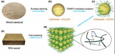 基于自下而上微米/纳米结构设计制备各向同性木材(RGI-wood)的示意图。