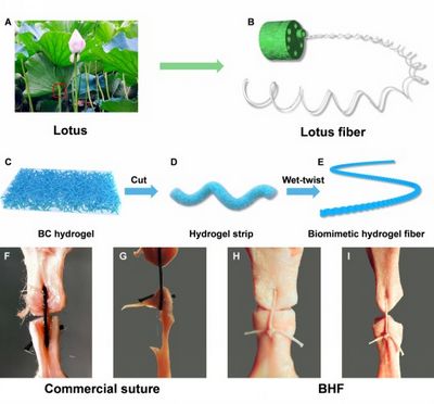 研究人员将细菌纤维素(BC)水凝胶加工成具有仿莲丝微米螺旋结构的水凝胶纤维(BHF),该水凝胶纤维兼具较高的强度和韧性,同时具有优异的亲水性和生物相容性,此外,仿生螺旋结构还赋予了该材料与人体皮肤相近的弹性模量,在伤口处受力变形时,BHF可有效缓冲并吸收能量,并与人体组织实现同步形变,从而避免割伤伤口造成二次伤害。相关研究成果发表在Nano Letters上。目前该材料相关专利已审核通过并获得授权。