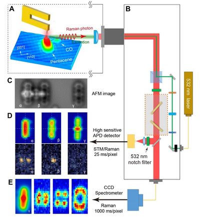 过去40多年里,扫描隧道显微术(STM)及其衍生出的多种高分辨的显微成像技术,如q-Plus原子力显微术(AFM),已经获得1埃量级的空间分辨能力,但这些显微技术缺乏化学识别能力。2013年,中国科学技术大学团队利用针尖增强拉曼成像技术(TERS)首次实现亚纳米级的化学识别,并于2019年将该技术空间分辨推进至1.5埃,为针对分子特异性的全局表征研究打下基础。