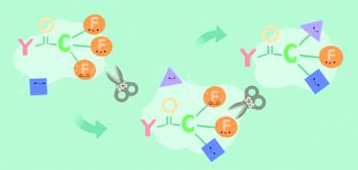 自旋中心转移反应过程第一次剪断三氟甲基中一个碳-氟键,使得碳原子和官能团(方块)成键,生成二氟化物;自旋中心转移反应过程第二次剪开产物二氟化物的一个碳-氟键,使另一个官能团(三角形)和碳原子成键,生成一氟化物