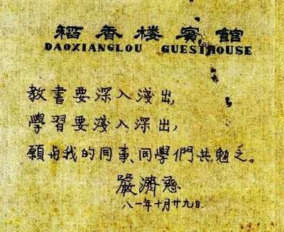 1981年10月,中国科学院副院长、中国科学技术大学校长严济慈先生到合肥布置学校重大工作,夜宿合肥市稻香楼宾馆,给科大师生题词:“教书要深入浅出,学习要浅入深出,愿与我的同事、同学们共勉之”。