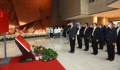 在渡江战役烈士名录厅,全体党员怀着无比崇敬的心情向烈士敬献花篮。一朵朵鲜花,寄托着对英烈的无尽哀思。舒歌群神情庄重,缓步走到花篮前,仔细整理花篮缎带,并带领大家向烈士三鞠躬。