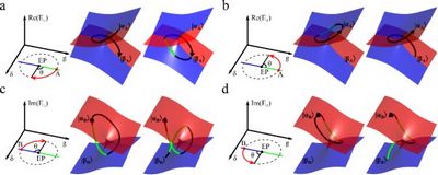 非厄米系统中存在一种特殊的简并点——奇异点。奇异点附近的能谱和厄米系统存在很大差异,呈现出两个撕裂的黎曼曲面相交环绕着奇异点的特殊拓扑结构(如图所示),并由此诱导了一些新奇物理现象。当调控哈密顿量参数,使其动力学地环绕奇异点时,会呈现出拓扑保护的本征态转换。
