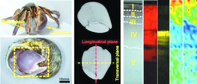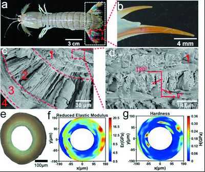 寄居蟹左螯的外骨骼分为5层。这些层状结构的局部力学性能与微结构和化学成分也密切相关。特别是结构中三维正交排列的几丁质纤维通过桥接和拔出机制有效地提高了材料的断裂韧性。