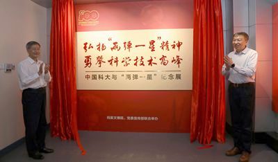 本报讯 为充分用好校史中的红色资源,传承弘扬“两弹一星”精神和老一辈科学家精神,学校特举办“弘扬‘两弹一星’精神 勇攀科学技术高峰”中国科大与“两弹一星”纪念展。6月17日上午,纪念展揭幕仪式在东活中心6楼博物馆举行。中管高校党史学习教育第八指导组组长张德祥、校党委书记舒歌群共同为纪念展揭幕,中管高校党史学习教育第八指导组成员、校党委理论学习中心组成员及校党群部门负责人、院级党组织书记出席揭幕式,校党委常委、副校长朱长飞主持揭幕式。