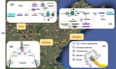 本报讯 近日,中国科大教授潘建伟及其同事张强、陈腾云与济南量子技术研究院王向斌、刘洋等合作,利用中科院上海微系统所尤立星小组研制的超导探测器,基于“济青干线”现场光缆,突破现场远距离高性能单光子干涉技术,分别采用激光注入锁定实现了428公里双场量子密钥分发(TF-QKD),同时利用时频传递技术实现了511公里TF-QKD,是目前现场无中继光纤QKD最远的传输距离。相关研究成果分别发表于国际著名学术期刊《物理评论快报》(被选为编辑推荐文章)和《自然·光子学》上,并被APS下属网站Physics SYNOPSIS栏目和英国《新科学家》报道。