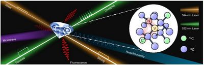 金刚石中的单个氮-空位色心示意图,图中展示了实验中使用的各类激光、微波、射频等调控手段。